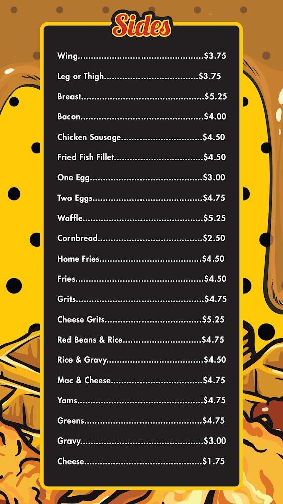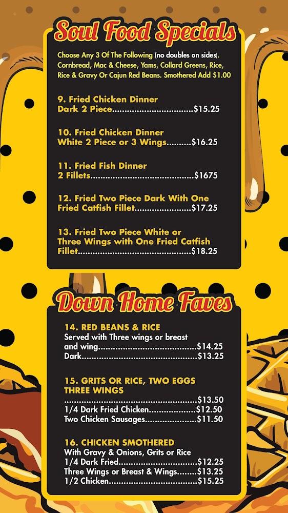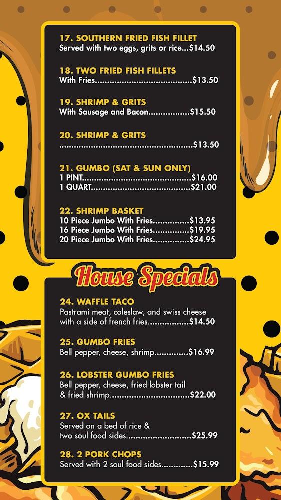 Breakfast favorites include shrimp and grits and grits with sausage and bacon. For sandwiches, the fried catfish fillet and wings are popular options. Specials like oxtail with rice and gravy showcase the restaurant's commitment to soul food traditions. Desserts, notably the sweet potato pie and peach cobbler, solidify a well-rounded experience after your meal.